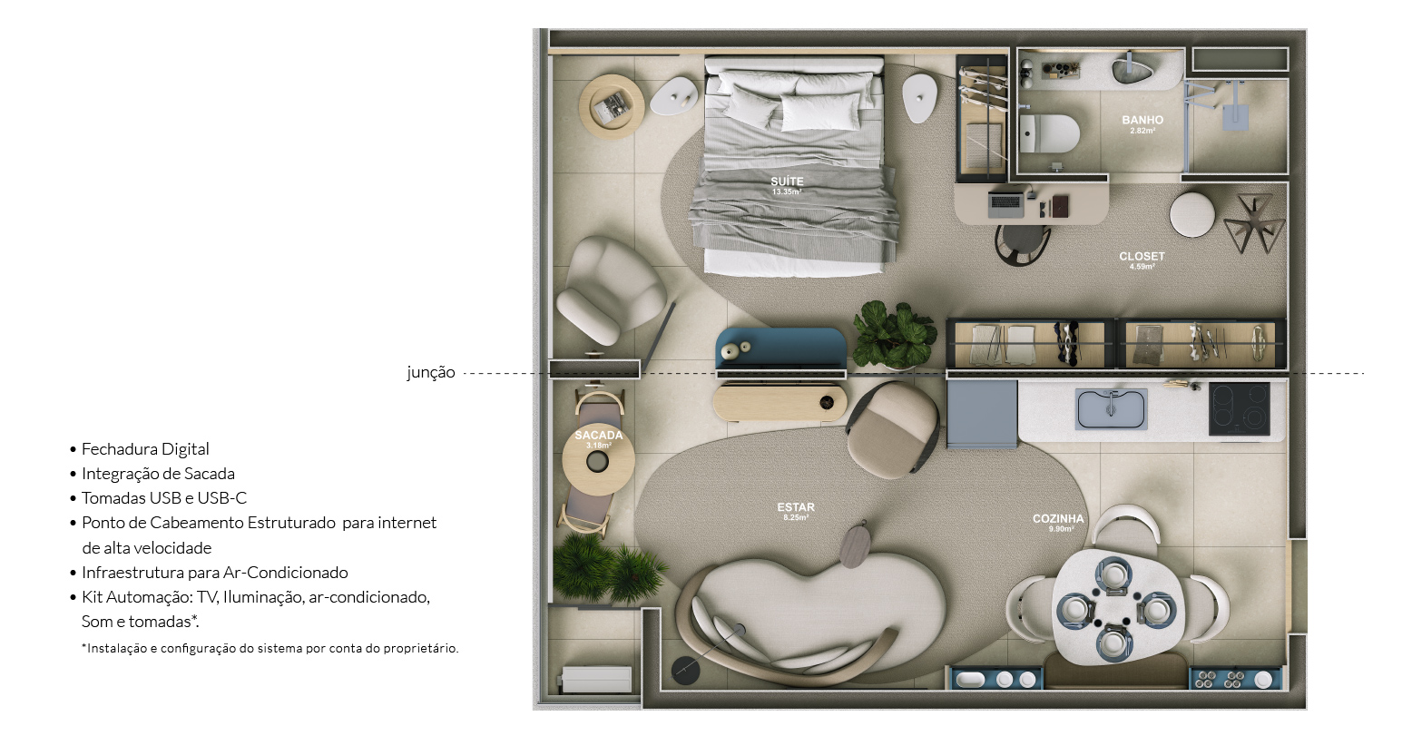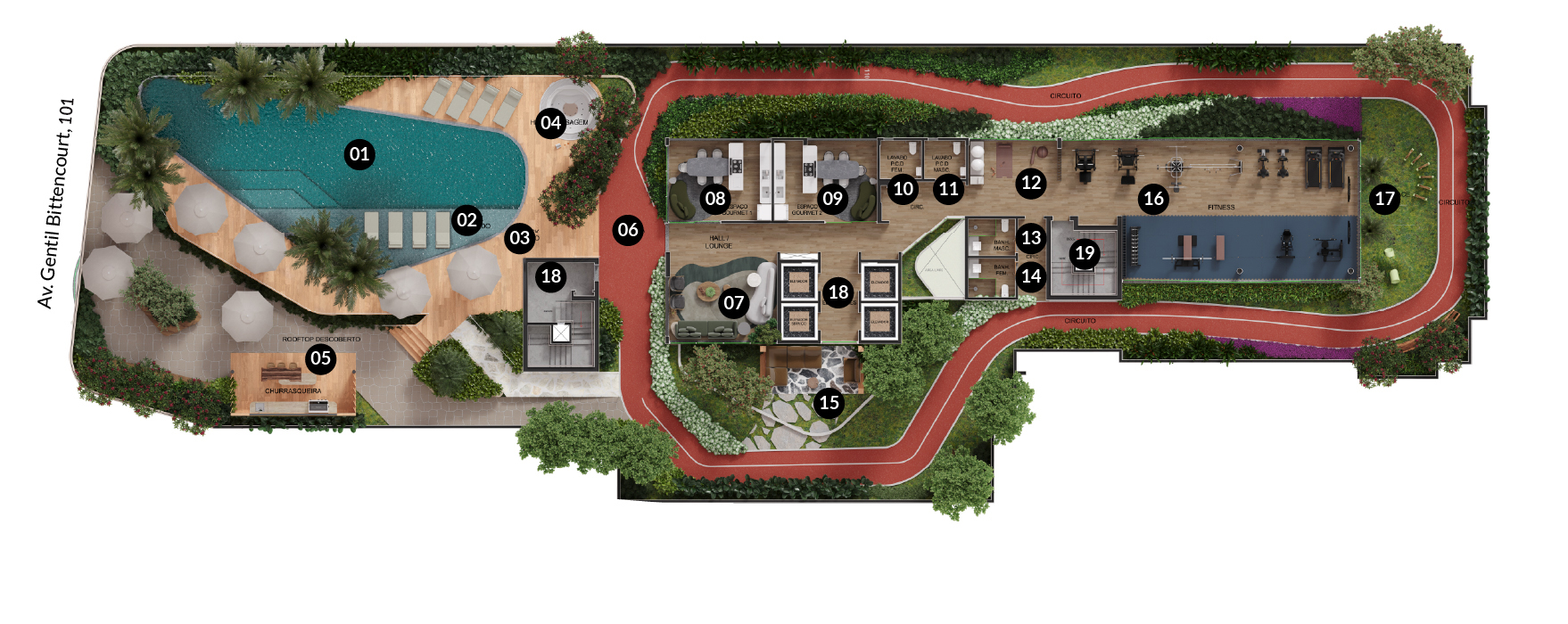 Um projeto inovador com unidades studio, apartamentos e área comum com minimercado, lavanderia e espaço delivery; opções de entretenimento como pub, espaço de jogos, rooftop com piscina, espaços arborizados, pista de corrida e muito mais. Além de tecnologia de sobra para lhe proporcionar máxima segurança e ainda mais comodidades.